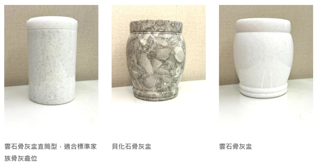 清雅堂,配備各式各樣全天然礦物骨灰盅,包括 : 雲石、青玉、黃玉、白玉及貝化石 。
